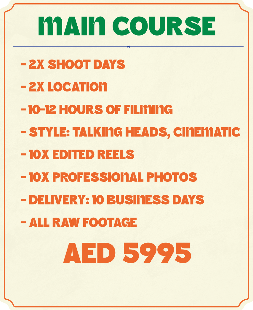 HomePortfolio MenuHomePortfolio Start Now dubai’s most creative and affordable content kitchen i want this content! it’s not your ordinary content kitchen, we cook delicious and affordable content piecesVideography, Reels, Landing Pages, Social Media, Podcast Shoots... What's on the menu? Buy Now Buy Now Buy Now Buy Now We can cook delicious content for: Some mouth watering content we cooked recently: View More Talk to us now and order some content for you!